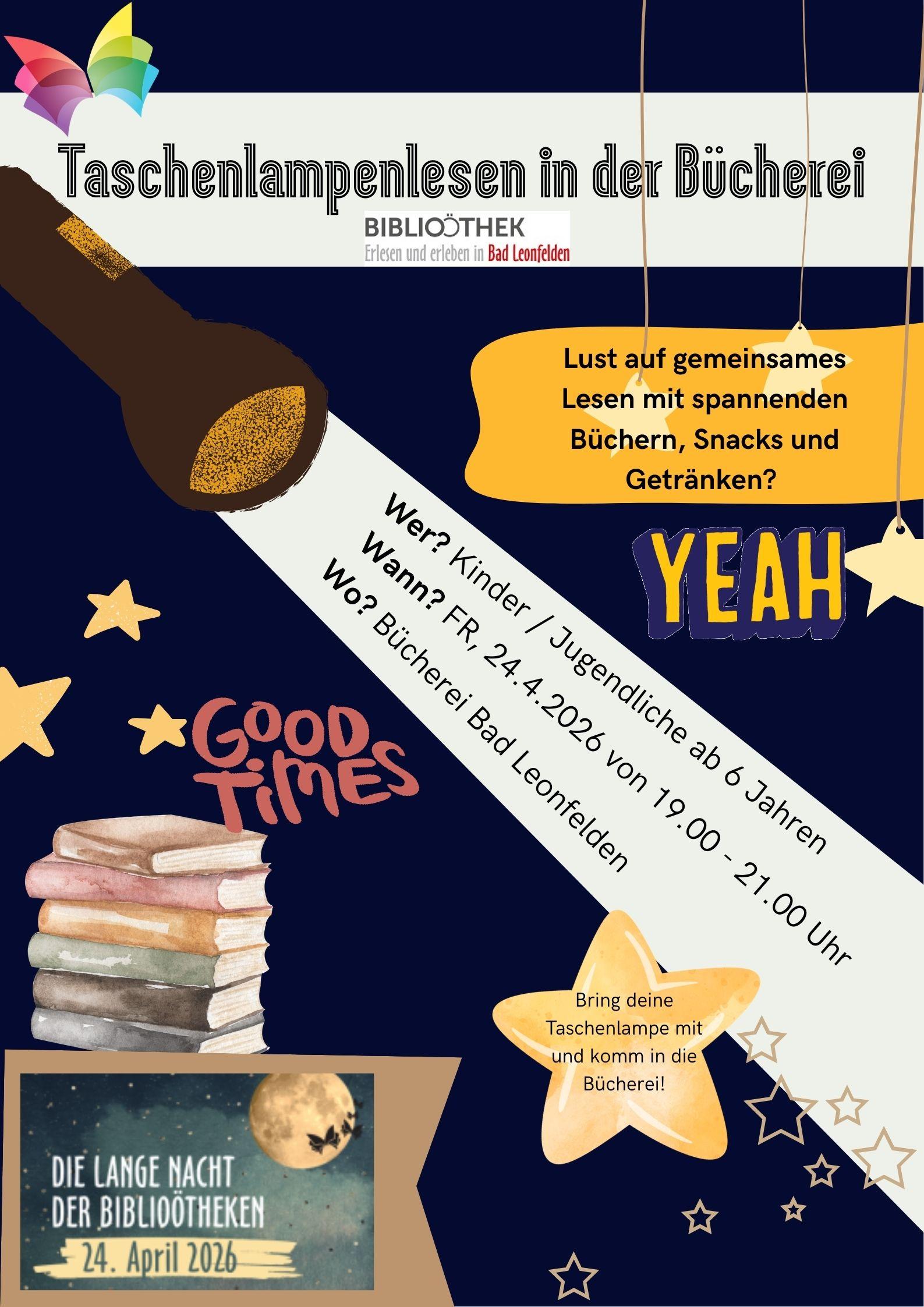Im Rahmen der „LangenNacht der Bibliotheken“ am 24. April 2026 veranstaltet die Bibliothek Bad Leonfelden von 19.00 - 21.00 Uhr erneut ein Taschenlampenlesen 📖🔦.